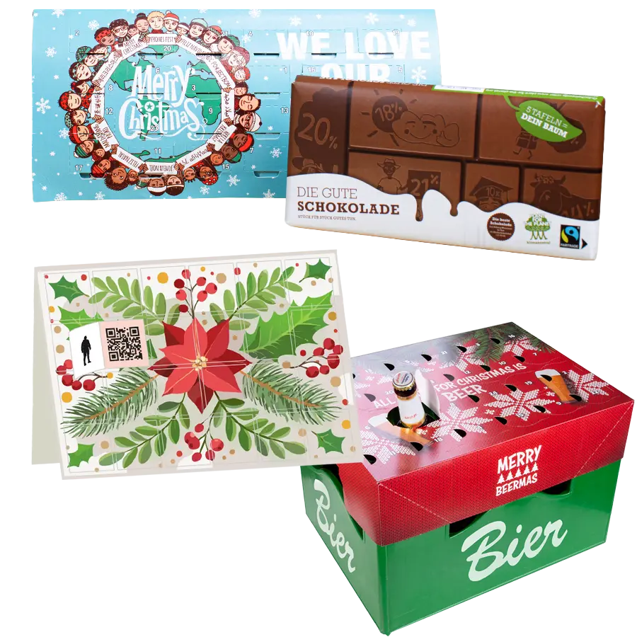 • Viel­falt pur: Ob klas­si­scher Scho­­ko-Advent­s­­ka­­len­­der, krea­ti­ver Cou­pon­ka­len­der, Bier­­kas­­ten-Coun­t­­down oder Model­le zum Selbst­be­fül­len – du hast die Wahl!