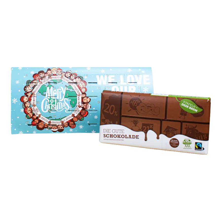 • Nach­hal­tig & lecker: Ent­de­cke den „Guten Advents­ka­len­der“ mit fair­trade Scho­ko­la­de von Plant-for-the-Pla­­net. Mit jedem Kauf unter­stützt du Auf­fors­tungs­pro­jek­te – süß und sinn­voll!