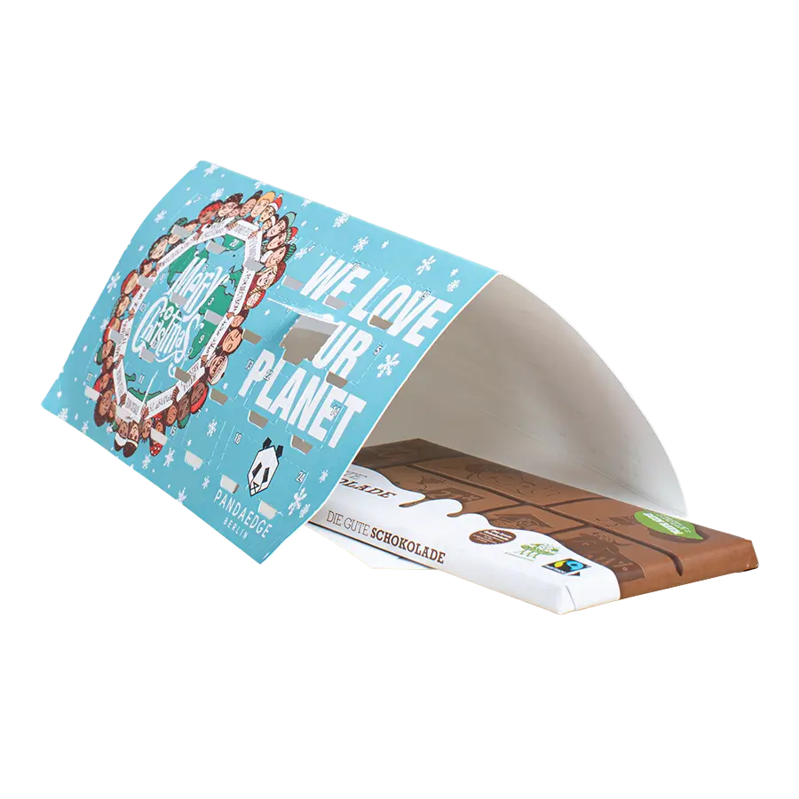 Innen bestückt mit einer Tafel leckerer Schweizer Vollmilch Schokolade, außen 24 Türen mit Impressionen rund um die erfolgreichste Fairtrade-Schokolade aller Zeiten.